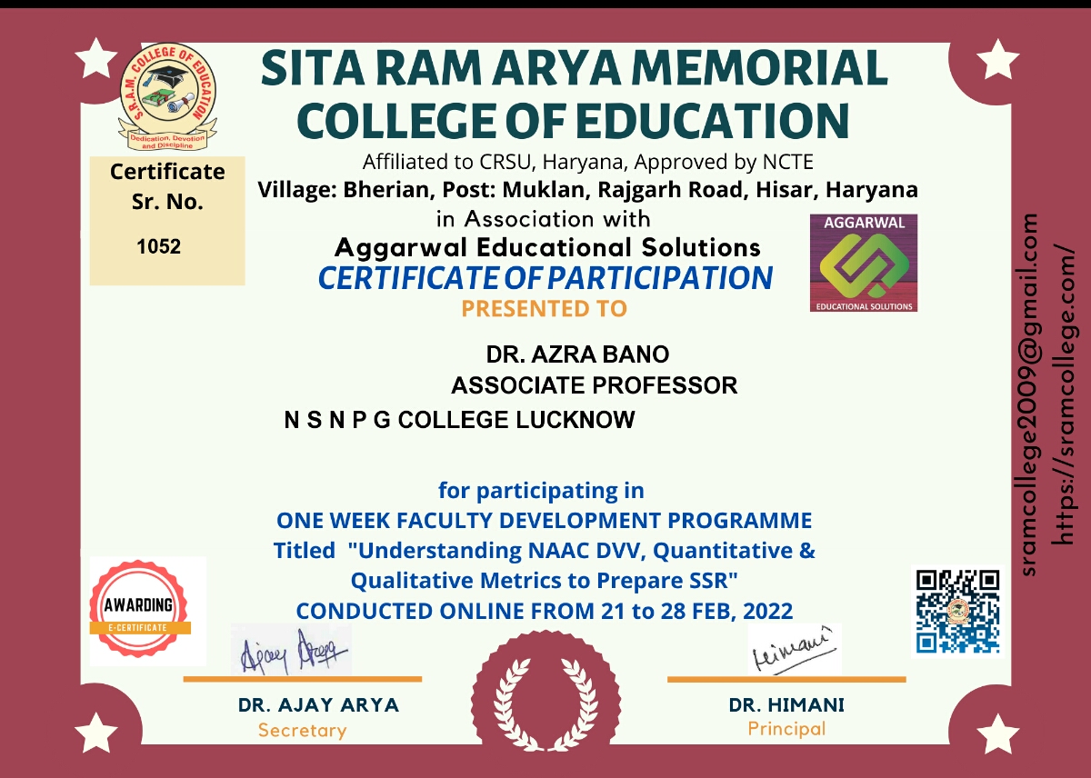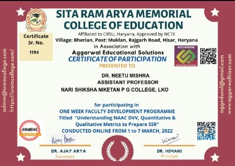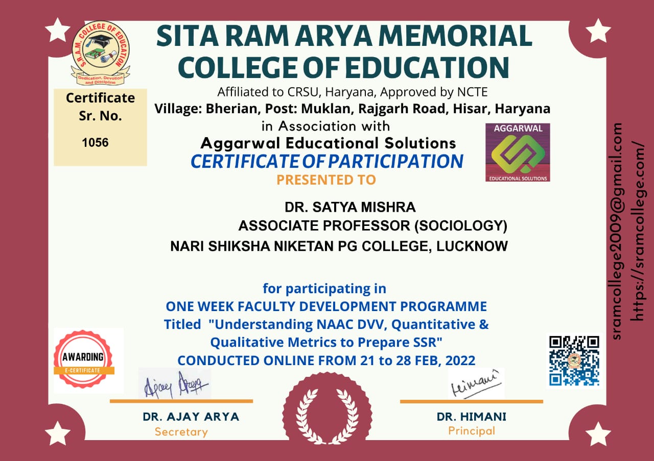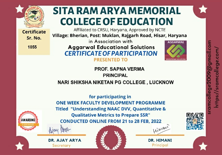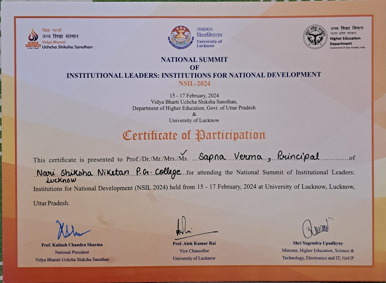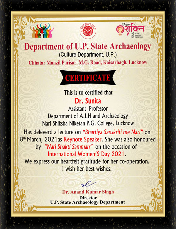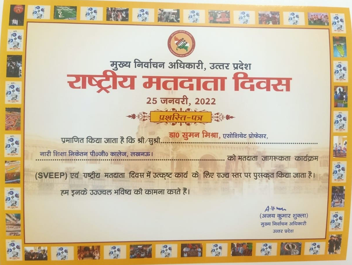 Dr. Suman Mishra Associate Professor Department of Political Science Nari Shiksha Niketan PG College Lucknow received ‘Annual State Award for Best Electoral Practices Award 2021’ on the twelfth National Voters Day on 25 January 2022. The award was conferred by the Chief Electoral officer, Uttar Pradesh. Dr. Suman Mishra is the District level trainer for voter awareness program for college students.