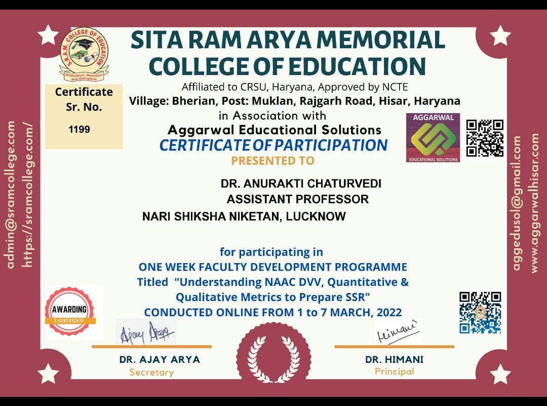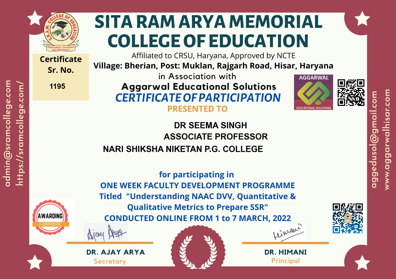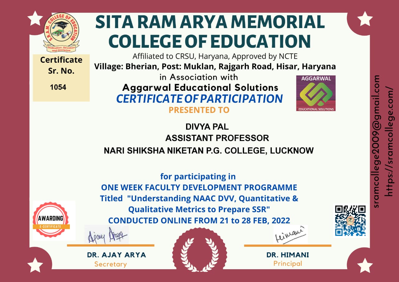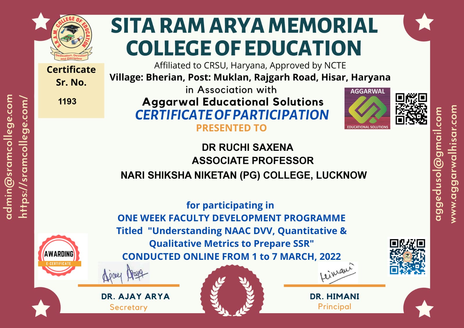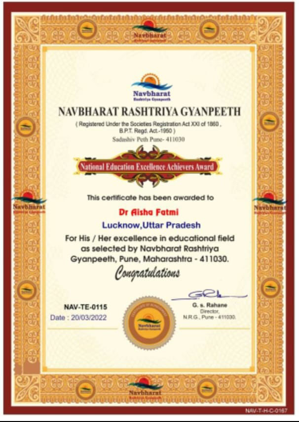 Dr. Suman Mishra Associate Professor Department of Political Science Nari Shiksha Niketan PG College Lucknow received ‘Annual State Award for Best Electoral Practices Award 2021’ on the twelfth National Voters Day on 25 January 2022. The award was conferred by the Chief Electoral officer, Uttar Pradesh. Dr. Suman Mishra is the District level trainer for voter awareness program for college students.