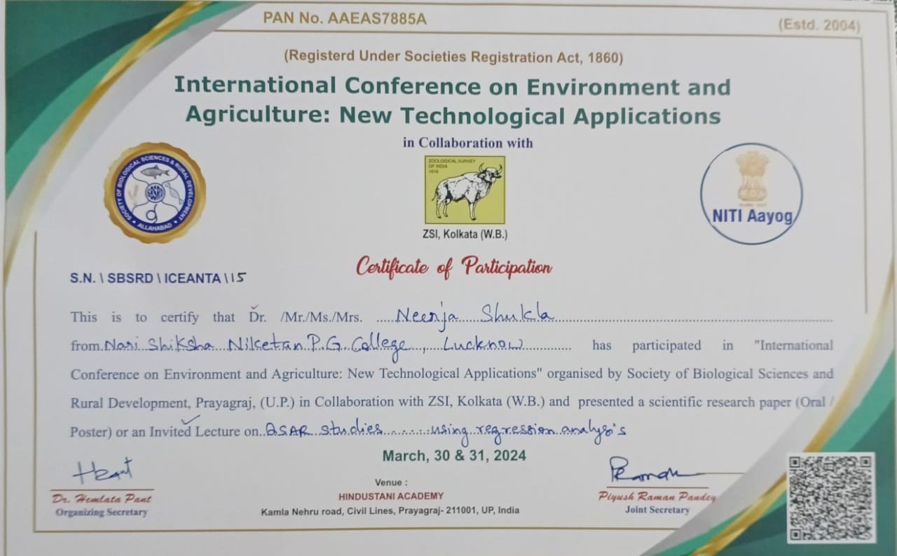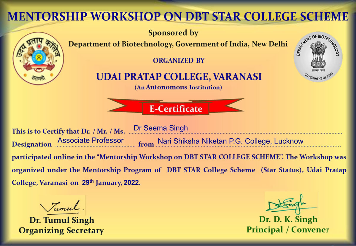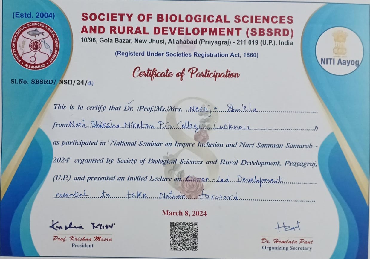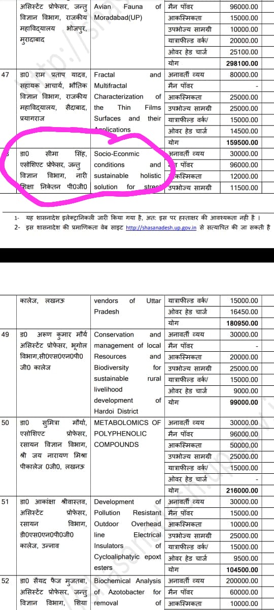 A grant of Rs180950 /- has been approved to Prof Seema Singh of Zoology Department under Research and Development Scheme for research work to the teachers of Government and Aided colleges of Uttar Pradesh by State Higher Education Council. Topic of her project is Socio-Economic Conditions and Sustainable Holistic Solution For Street Vendors of Uttar Pradesh. Duration of her project is two years i.e.1st April 2023 to 31st March 2025