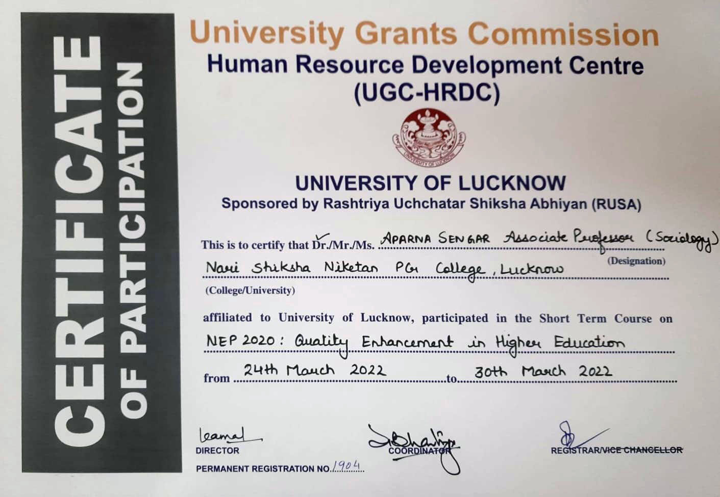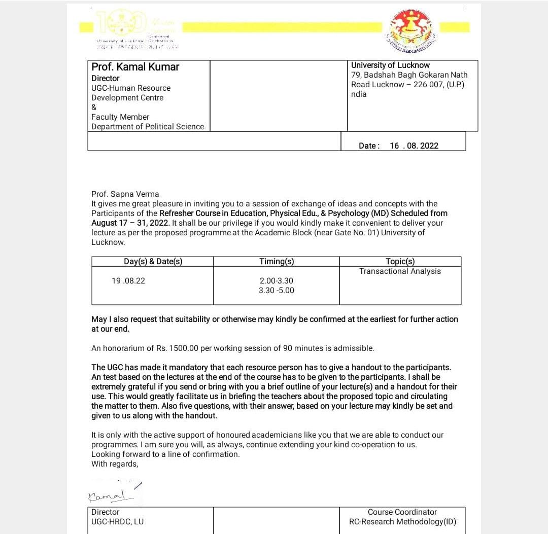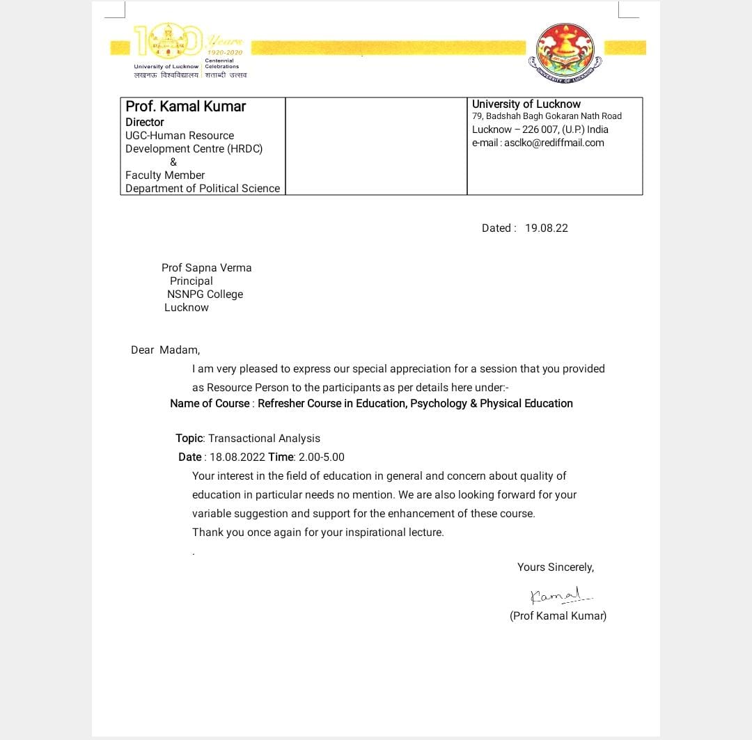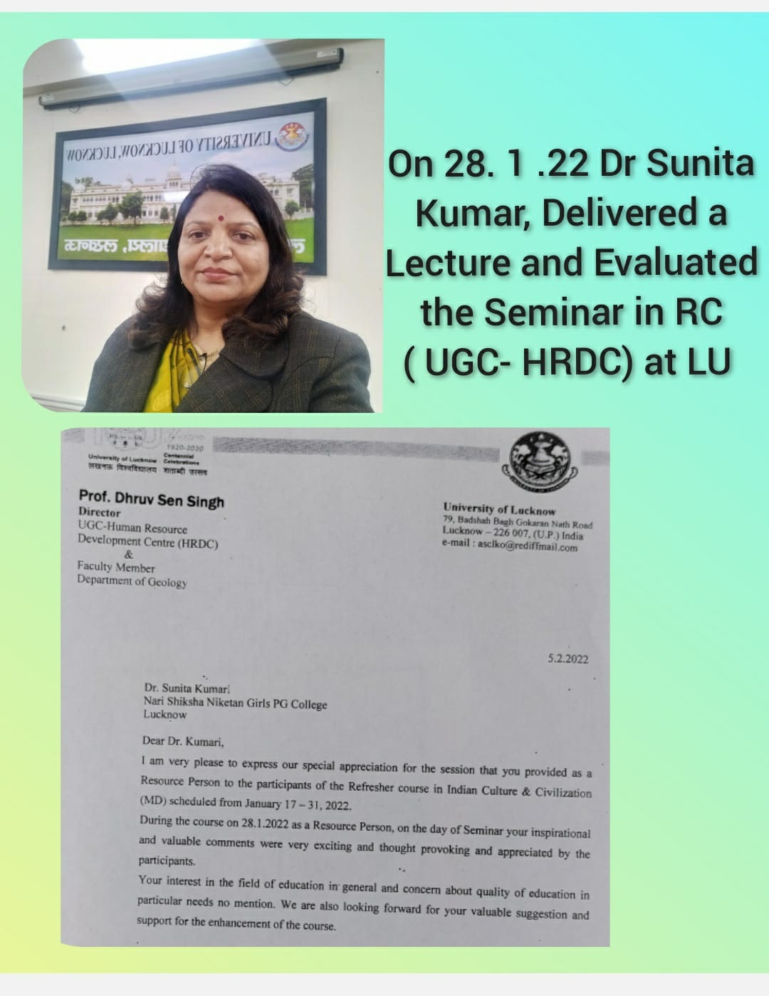 On 28.1.2022 Dr. Sunita Kumar, Delievered a Lecture and Evaluated the Seminar in RC (UGC-HRDC) at Lucknow