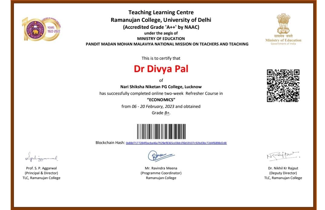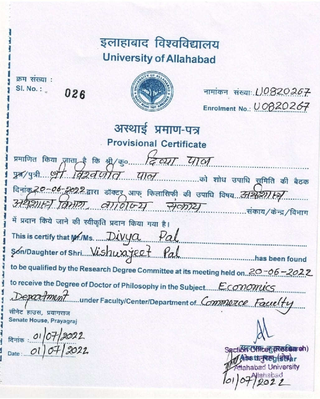 Ph.D Awarded to Mrs. Divya Pal, Assistant Professor in the department of Economics on 20.06.2022.
