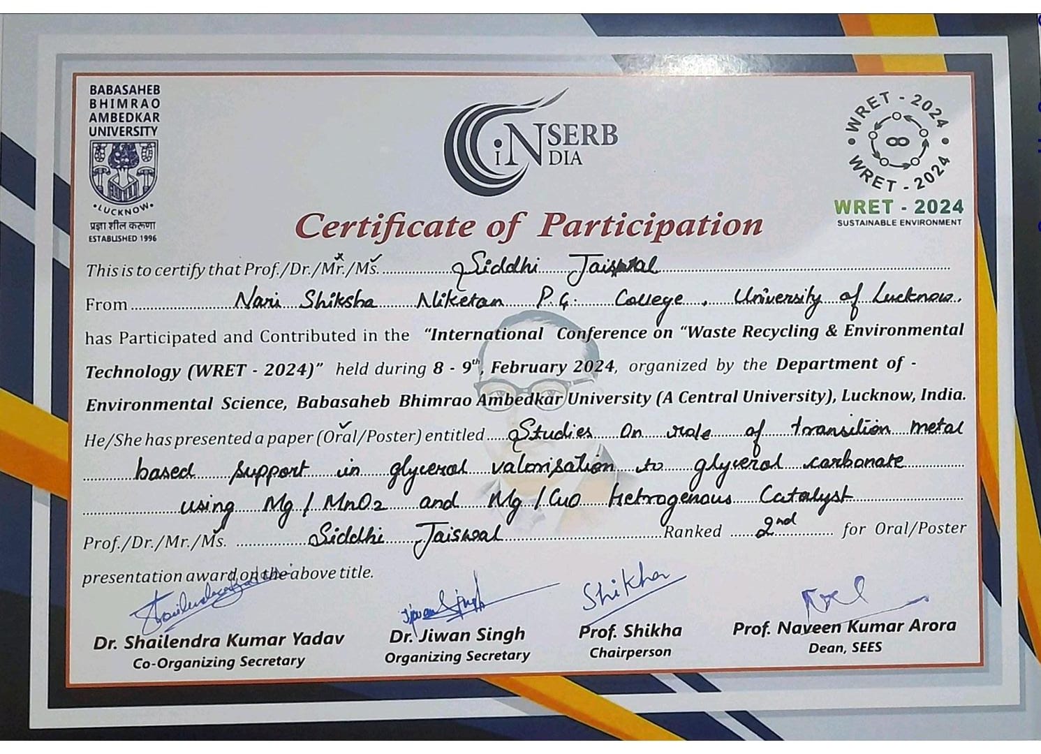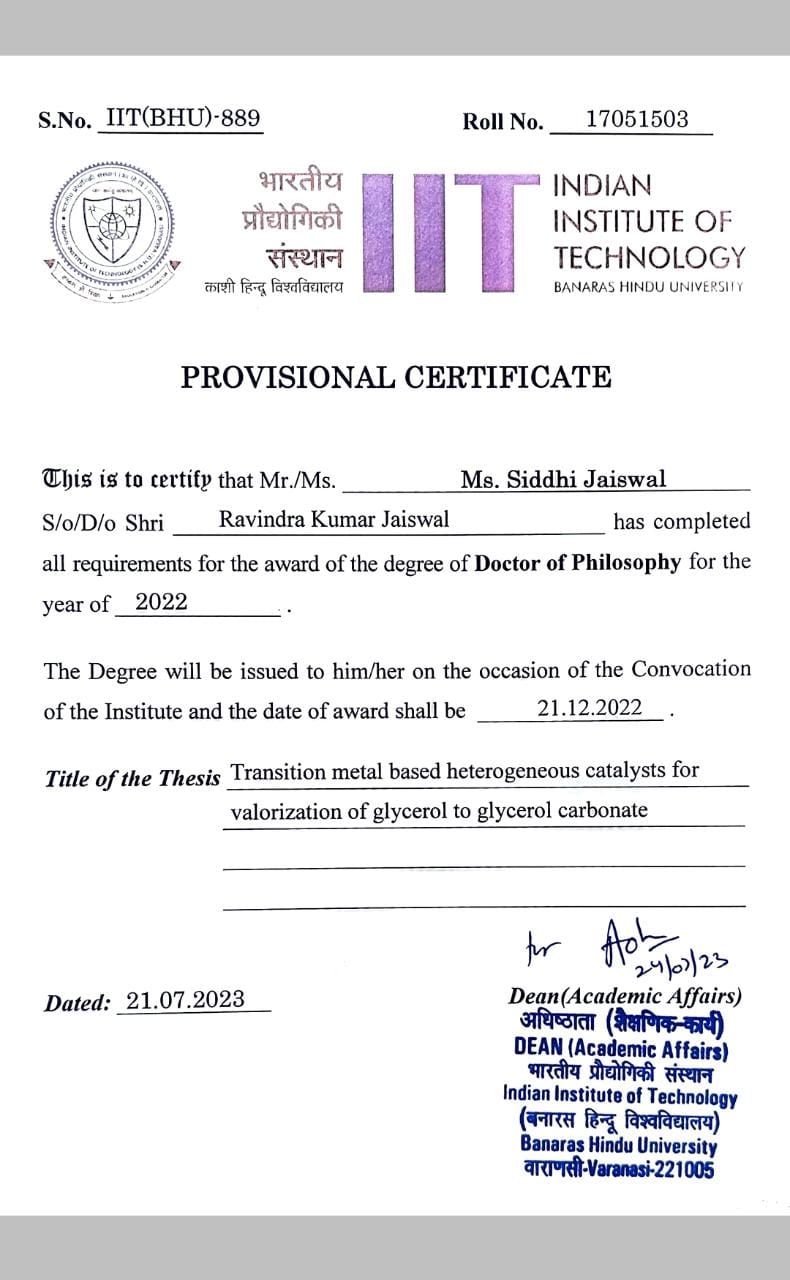 Ph.D Awarded to Dr. Siddhi Jaiswal, Assistant Professor in the department of Chemistry on 17th July 2023