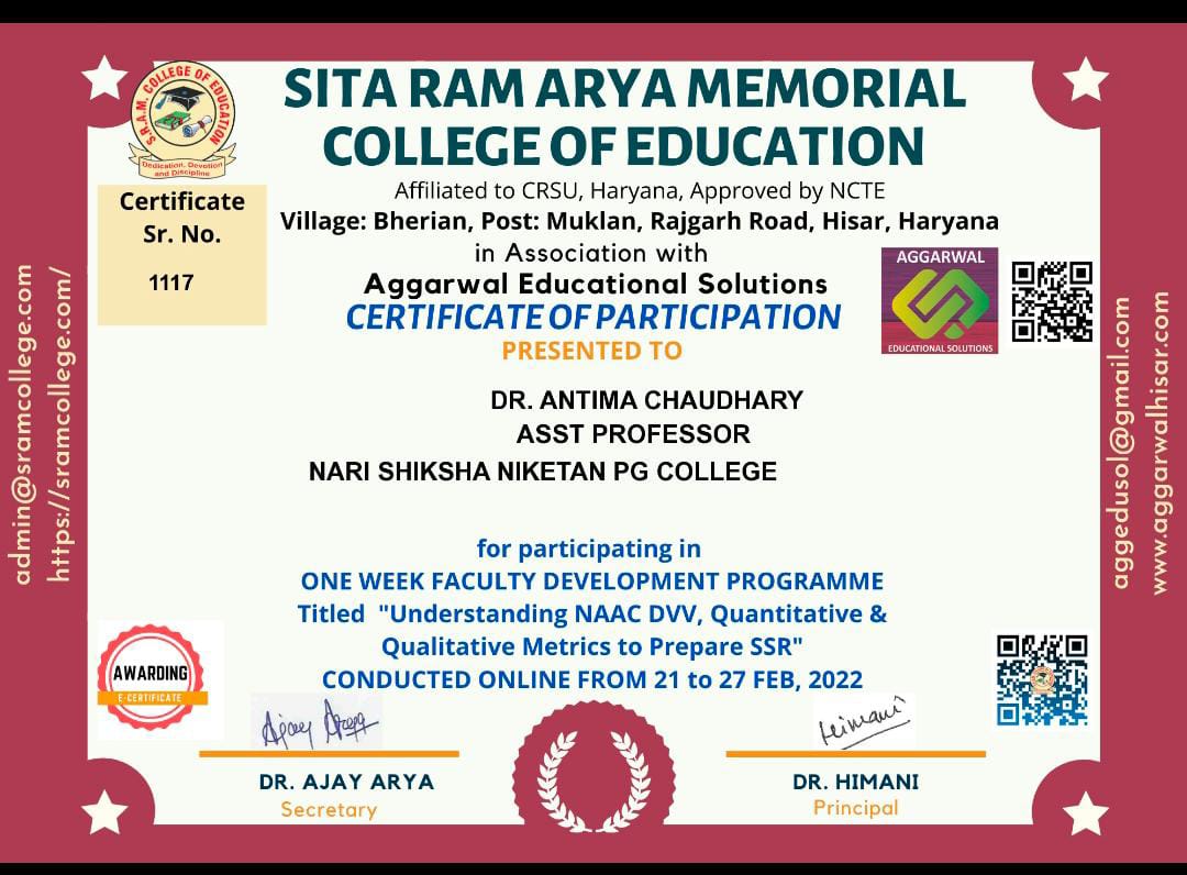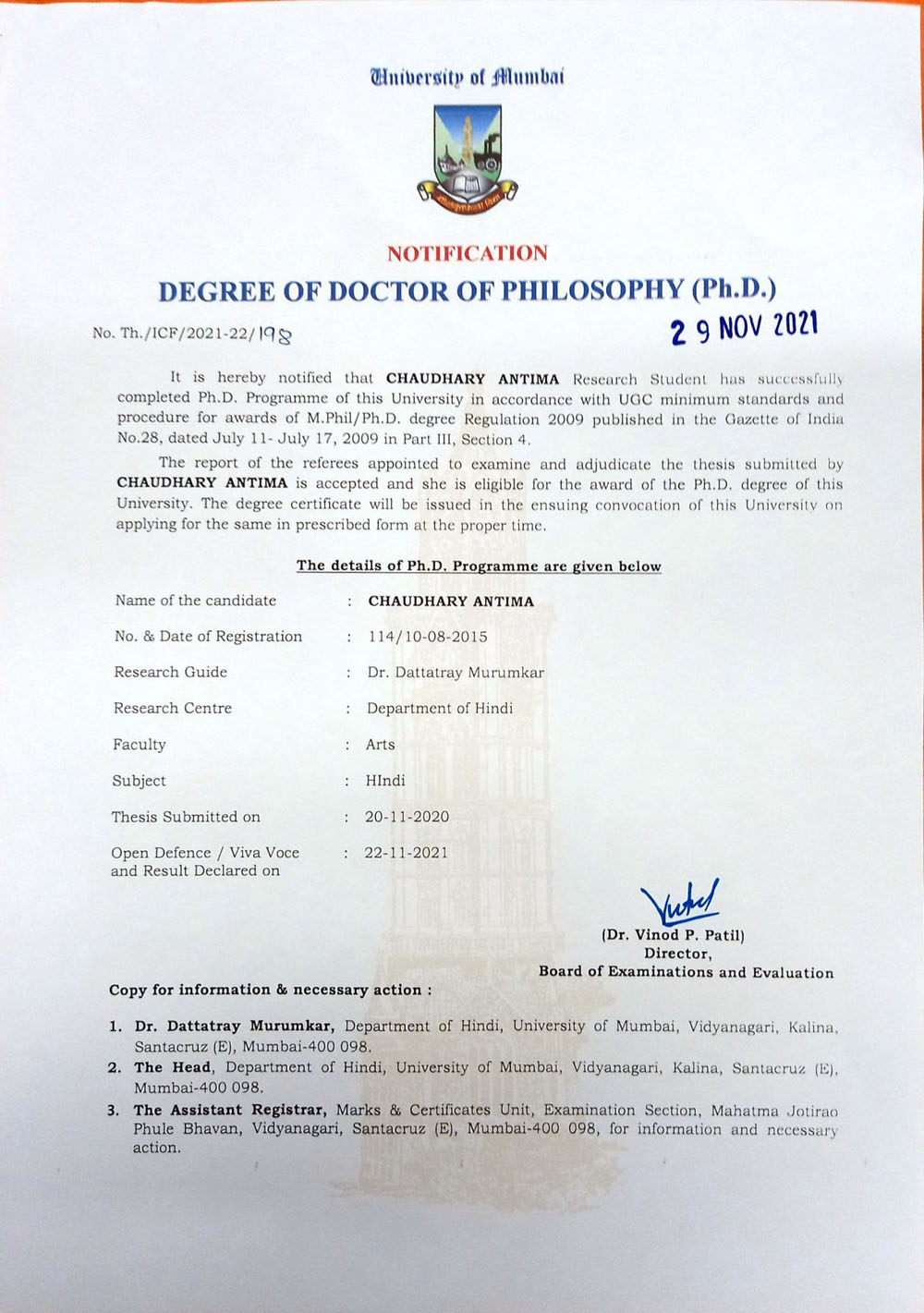 Ph.D. Awarded to Ms. Antima Chaudhary, Asstt. Professor in the department of Hindi on 22.11.2021