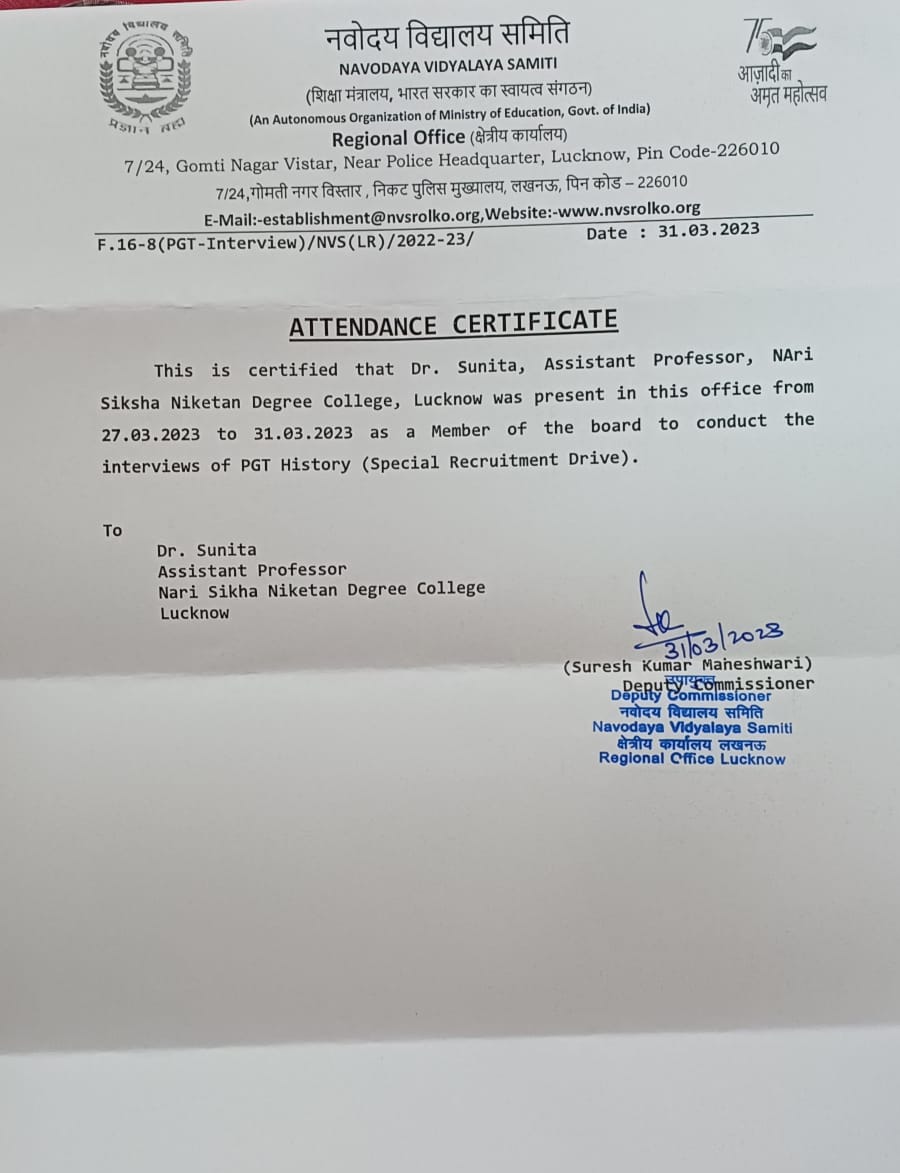 Dr. Sunita, Associate Professor had been appointed as subject expert of interview board of PGT (History) Navodaya Vidyalaya Samiti, Lucknow